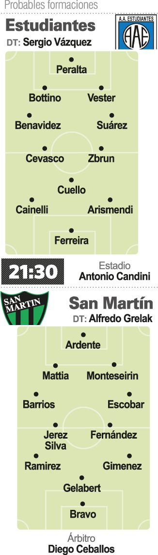 Del lado de Estudiantes, el mendocino Marcelo Vazquez parece tener todo definido y repetirá igual los mismos nombres que vienen de hacer ruido bajando a Estudiantes de Caseros en la fecha pasada. El sistema es similar al de San Martín con línea de cuatro, dos centrales, tres volantes ofensivos y un punta, con nombres conocidos como el de Gastón Bottino hoy jugando de primer central y Alan Vester, puntales de su ascenso desde el Federal A.