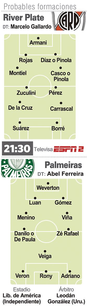 River, finalista de las últimas dos ediciones de la Copa Libertadores de América, recibirá hoy a Palmeiras en el primer partido de la semifinal que se definirá la semana próxima en Brasil. El encuentro se jugará desde las 21.30 en el estadio Libertadores de América de Avellaneda, donde el "Millonario" hace de local, con el arbitraje del uruguayo Leodán González y televisación de ESPN. El VAR estará a cargo del chileno Julio Bascuñán. La vuelta se disputará el próximo martes 12 en el estadio Allianz Parque de San Pablo y el ganador se clasificará a la gran final única del sábado 30 de enero en el Maracaná de Río de Janeiro.