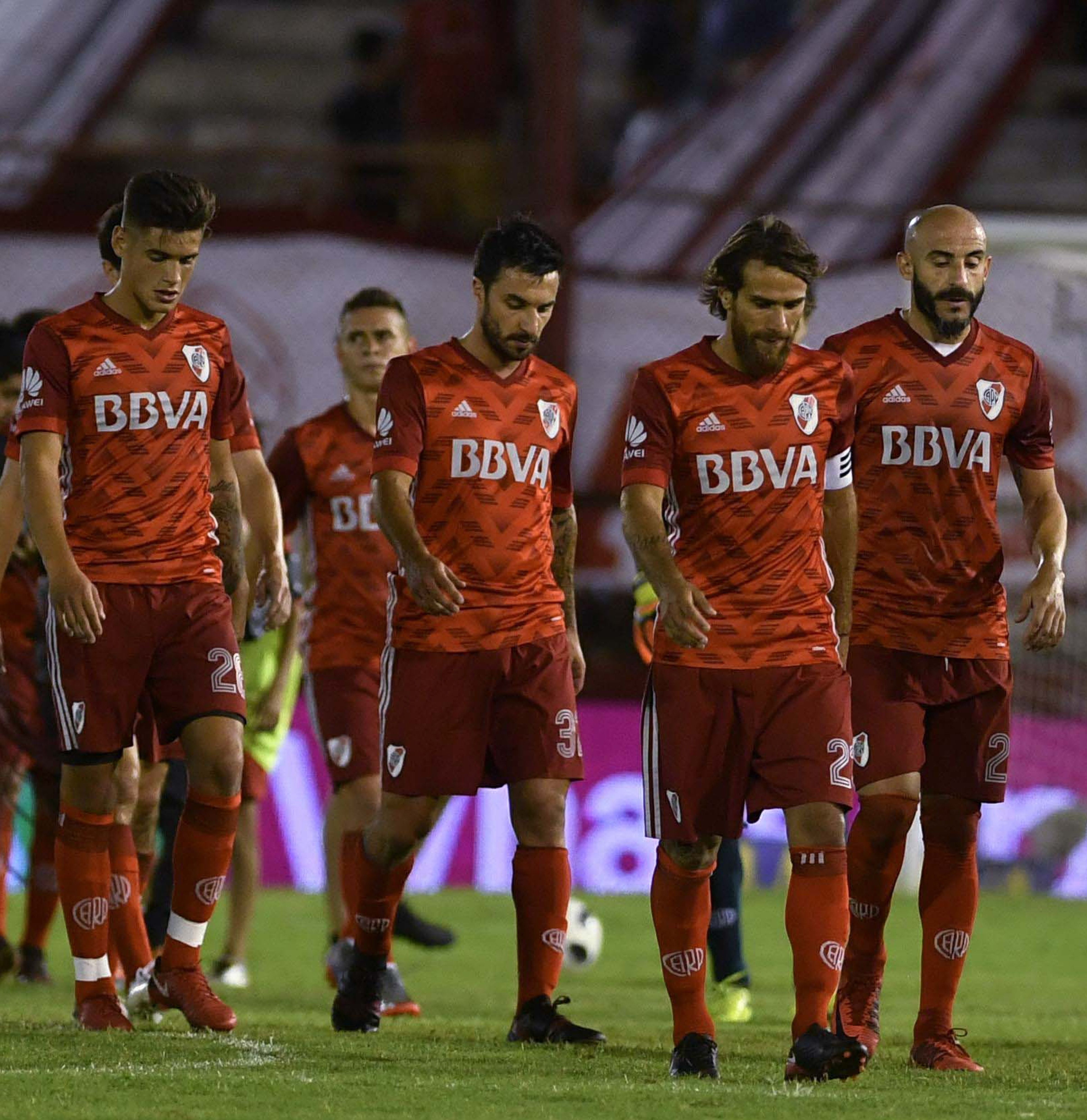 Imagen repetida. Cabizbajos, los jugadores de River se retiraron anoche del campo de juego tras perder ante Huracán. La imagen se había repetido en la primera parte del torneo y se mantiene en el reinicio de la Superliga.