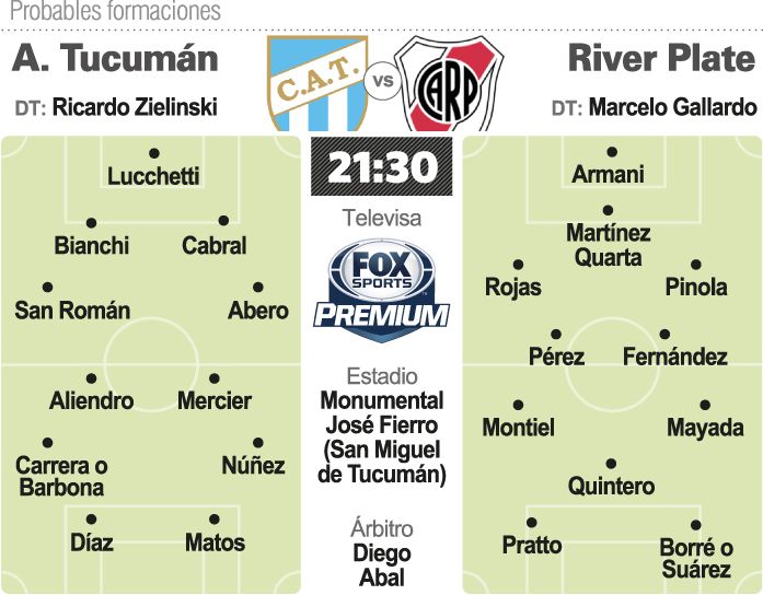 Para el encuentro ante los tucumanos, si bien no confirmó el equipo, el ‘Muñeco‘ volvería a la línea de tres defensores y reservaría a Leonardo Ponzio para el partido del próximo miércoles contra Palestino (Chile) en el Monumental de Núñez, válido por la segunda fecha de la fase de grupos de la Libertadores. Además hoy jugarán abriendo el domingo a las 17.10 Estudiantes-Gimnasia y a las 19.20 Independiente-Aldosivi y Huracán-San Martín de Tucumán.