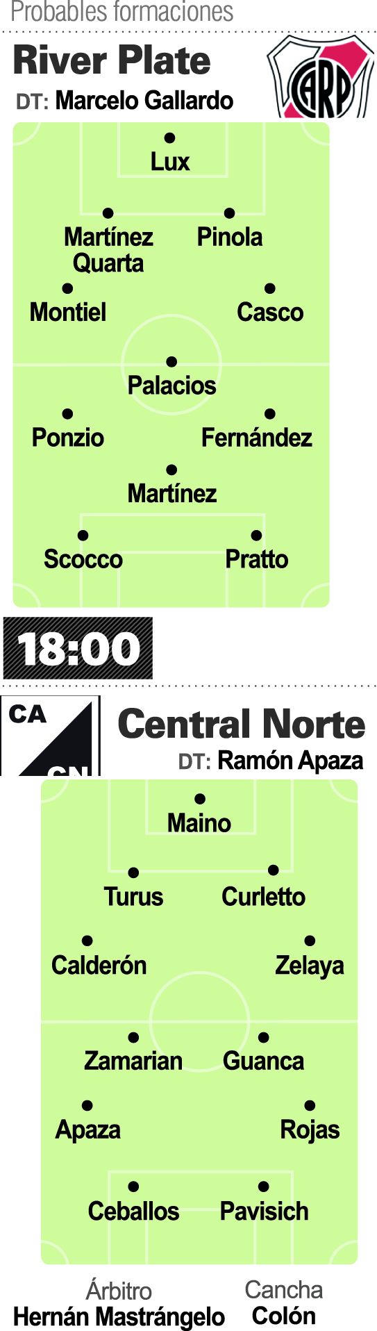 Arranca la competencia oficial en el segundo semestre de 2018 para River, que defenderá la doble corona que ostenta en la Copa Argentina. Para ello, los dirigidos por Marcelo Gallardo deberán vencer a Central Norte de Salta, por los 32vos de final. El entrenador confirmó el equipo que enfrentará al Cuervo hoy, a las 18 (por TyC Sports), en Santa Fe, en el estadio de Colón, con la ilusión de obtener un triunfo que le otorgue el acceso a la próxima llave, en donde espera Villa Dálmine. El Muñeco confirmó que jugarán juntos Lucas Pratto e Ignacio Scocco, además de anunciar que no serán convocados Franco Armani, Enzo Pérez y Juan Quintero.