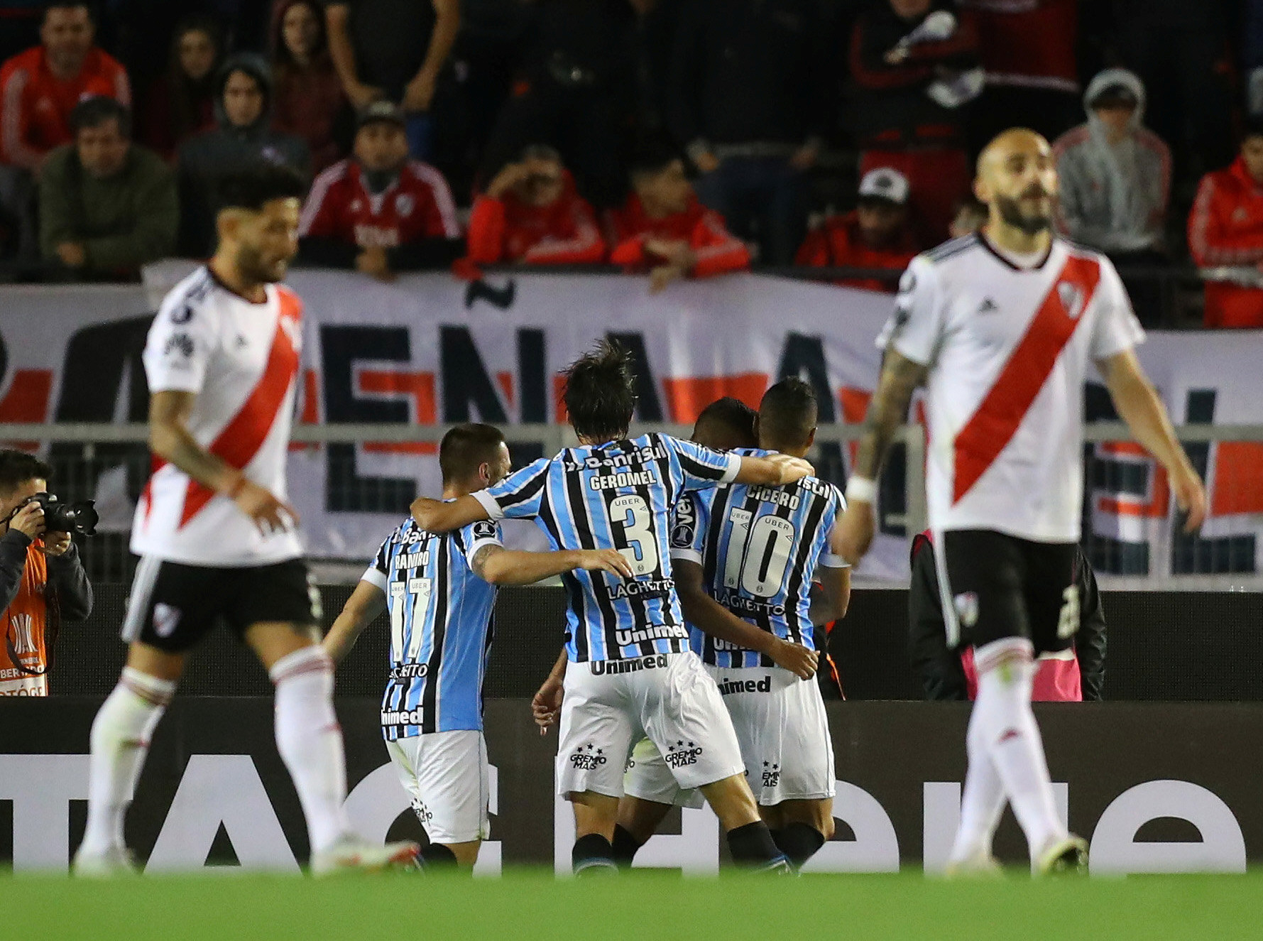 Sacudón. Milton Casco y Javier Pinola son la cara de la decepción en River, mientras atrás los jugadores de Gremio celebran el gol de Michel. El equipo de Marcelo Gallardo tendrá que ir a ganar a Porto Alegre ante el último campeón de la Copa Libertadores.