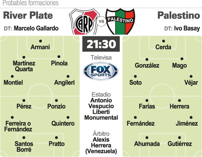 River, el último campeón de la Copa Libertadores, tendrá hoy su primer partido como local en la edición 2019 del torneo, sin público, en el estadio Monumental contra Palestino de Chile. River y Palestino se medirán desde las 21.30, con transmisión a cargo de Fox Sports y el arbitraje del venezolano Alexis Herrera, por la segunda fecha del Grupo A de la Copa Libertadores. El equipo dirigido por Marcelo Gallardo jugará sin hinchas por el castigo que le impuso la Conmebol (dos fechas a estadio vacío como local) por los incidentes previos al partido de vuelta de la final del año pasado contra Boca. El encuentro de vuelta de la histórica superfinal, que debía disputarse el 24 de noviembre en el Monumental, se suspendió por la agresión que sufrieron los jugadores de Boca cuando el micro que los trasladaba al Monumental fue apedreado a pocas cuadras del estadio.