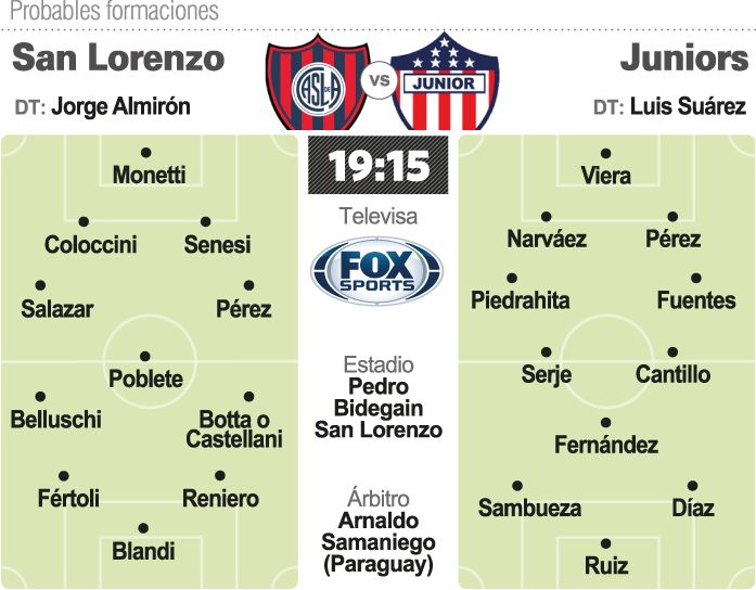 Mientras que San Lorenzo, que no gana desde hace cuatro meses, recibirá a Junior, de Colombia, por la segunda fecha del grupo F de la Copa Libertadores de América, en un partido clave para la continuidad del entrenador Jorge Almirón. El estadio Nuevo Gasómetro será el escenario del partido que comenzará a las 19.15 con arbitraje del paraguayo Arnaldo Samaniego y será televisado por la señal Fox Sports.