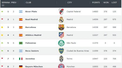 River aparece en lo más alto del ranking mundial de clubes, por encima de Real Madrid, Barcelona, Atlético de Madrid y Palmeiras. La nómina, que se actualiza semanalmente, otorga puntos por partidos y títulos según la "calidad" de los mismos" y el Millonario suma 14.883.