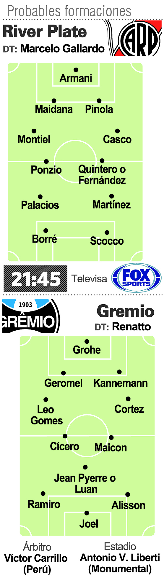 Con la misión de evitar un tropiezo, el once gaúcho apelará a la seguridad del arquero Marcelo Grohe, y a la solidez de la pareja central que componen el argentino Walter Kannemann y Pedro Geromel. Con la misión de reconquistar la Copa Libertadores que alzó por tercera y última vez en 2015, River tiene planeado lanzarse al ataque frente a Gremio, más allá de que el viernes pasado dejó su invicto de 32 partidos oficiales en Santa Fe, donde perdió 1-0 con Colón por la Superliga local. Un mal paso con razones.