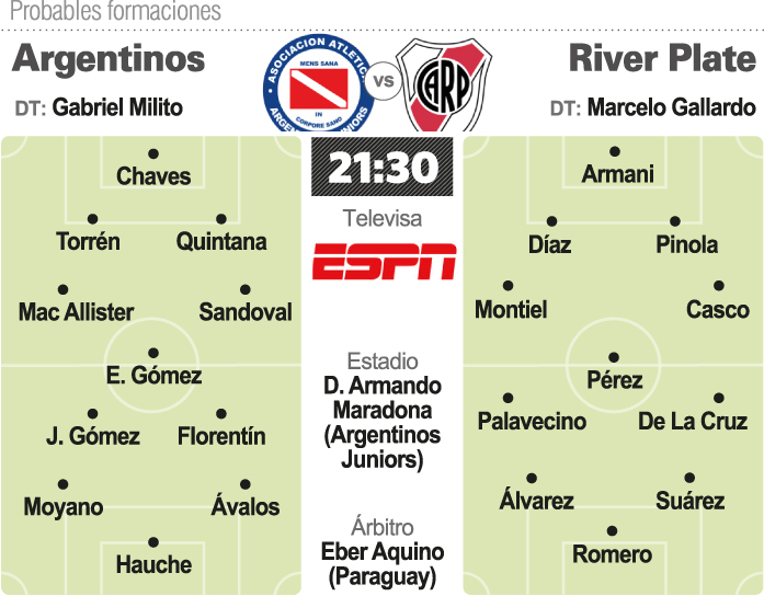 River Plate, que ha mermado en su rendimiento y en la obtención de buenos resultados en los últimos tiempos de la mano del entrenador Marcelo Gallardo, visitará hoy a un difícil Argentinos Juniors, que le empató de visitante 1 a 1 en la ida, en el cotejo desquite de los octavos de final de la Copa Libertadores. El encuentro se jugará este miércoles a partir de las 21.30 en el estadio Diego Maradona, en el barrio porteño de La Paternal, con el arbitraje del paraguayo Eber Aquino y televisado por ESPN. El vencedor de esta llave enfrentará al triunfador de Atlético Mineiro de Brasil y Boca Juniors.