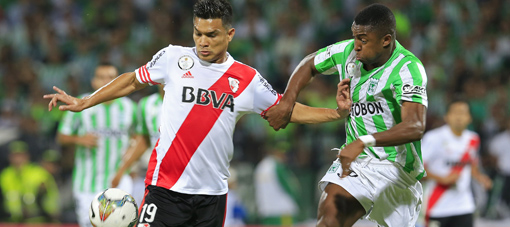 El conjunto local tuvo una primera parte impecable. El equipo de Medellín mostró un gran juego colectivo ante un River que no hacía pie en el campo de juego y que caía en constantes imprecisiones. Atlético Nacional sacaba amplio provecho de los pases a sus volantes por afuera, quienes encontraban terreno para correr a las espaldas de los laterales de River.