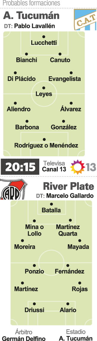 Gallardo decidió seguir utilizando el artículo 225 para que jueguen el paraguayo Jorge Moreira y Lucas Alario (aunque los perderá el fin de semana frente a San Lorenzo), pero no podrá contar con Jonatan Maidana, suspendido por acumulación de tarjetas amarillas. El cotejo de hoy será el comienzo de una serie de partidos decisivos para River pues el domingo visitará a San Lorenzo y, luego del receso por la fecha FIFA, recibirá a Racing, antes de encarar las dos últimas fechas del torneo.
