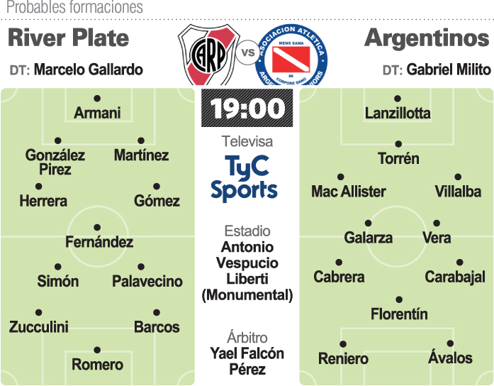 River Plate, con una formación alternativa preservando algunos titulares para jugar la Copa Libertadores, recibirá hoy a un Argentinos Juniors que intentará aprovechar la circunstancia para sumar, en su objetivo de ser uno de los cuatro clasificados de la Zona A para los cuartos de final de la Copa de la Liga Profesional de Fútbol (LPF). El partido se jugará en el estadio Monumental desde las 19, con el arbitraje de Yael Falcón Pérez y televisación por parte de TNT Sports codificado.