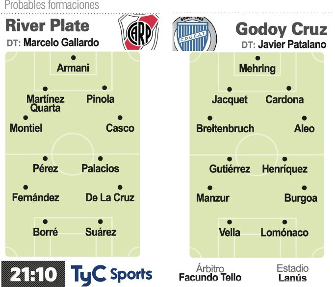 Hoy en Lanús, River jugaría con la misma formación que goleó a Huracán 4-0 en Parque de los Patricios según lo que dejó vislumbrar Gallardo. El rival de este equipo "Millonario" es Godoy Cruz, conjunto mendocino que atraviesa una crisis de resultados y presenta su peor inicio de temporada desde que está en primera con un 17% de eficacia. El "Tomba" está anteúltimo con apenas tres unidades, producto de un triunfo (cuarta fecha de Superliga ante Estudiantes) y cinco derrotas, superando apenas a Gimnasia y Esgrima la Plata que tiene como estelar entrenador a Diego Maradona.