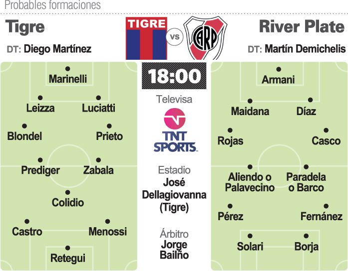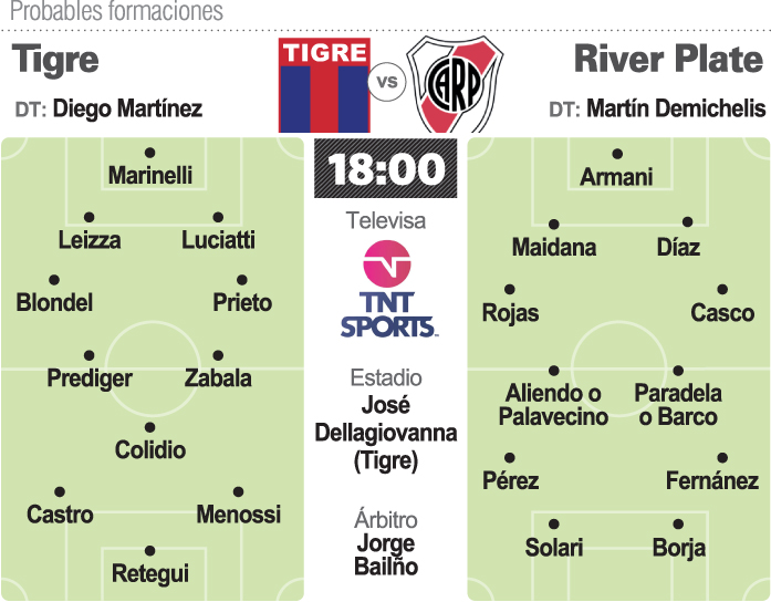 De cara al partido con Tigre, Demichelis podrá contar con el delantero colombiano Miguel Borja, pero aguardará por José Paradela. En caso que el ex Gimnasia La Plata no llegue en óptimas condiciones, Esequiel Barco y el juvenil Franco Alfonso se disputan su lugar. Demichelis también analiza la vuelta a la titularidad del defensor paraguayo Robert Rojas, en reemplazo de Andrés Herrera, y la chance de incluir al volante Agustín Palavecino por Rodrigo Aliendro
