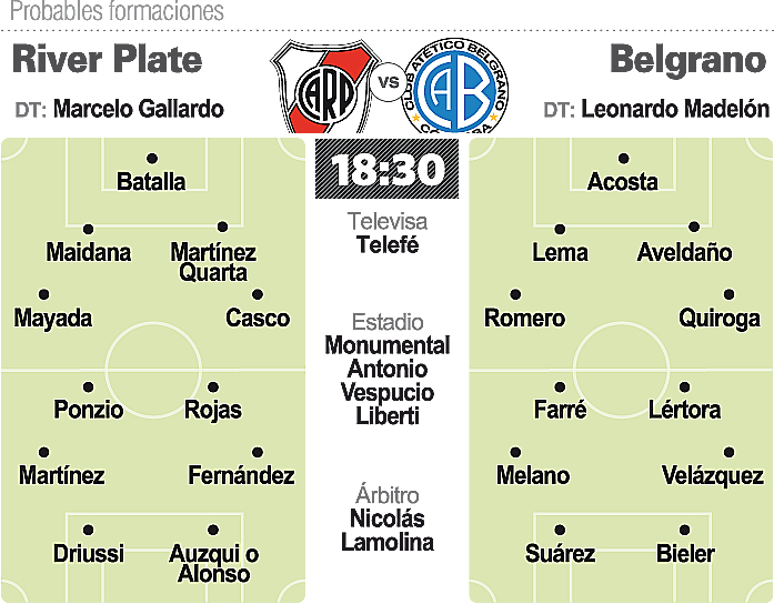 Sin Lucas Alario convocado al seleccionado argentino para el partido del martes ante Bolivia, en La Paz, Gallardo incluirá en ofensiva junto a Driussi a Carlos Auzqui o al uruguayo Iván Alonso. El resto, serán los mismos del último encuentro. Enfrente estará Belgrano, que viene de superar como local 2-0 a Racing y tendrá dos variantes: Cristian Romero por Renzo Saravia y Juan Quiroga por Luna.