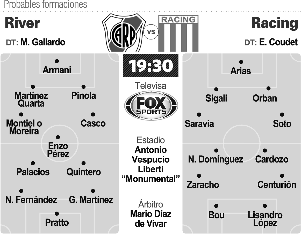 Por su parte, el equipo de Eduardo Coudet es uno de los que más goles metió en la Superliga Argentina. Pero la historia los coloca como el equipo denominado "Grande" al que más veces ha derrotado el Millonario. Pero eso sí, si Racing anota un gol en el Monumental, River se verá obligado a convertir dos justamente en medio de la peor racha de su historia en el comienzo de un campeonato local: nunca antes había llegado a las tres primeras fechas sin pegar un solo grito. El riesgo, en este caso, es que la sequía se transforme en una carga psicológica difícil de sobrellevar para sus jugadores. Que se les cierre el arco, que se les vuelva más chiquito súbitamente. Hoy, en definitiva, ellos tendrán la palabra.