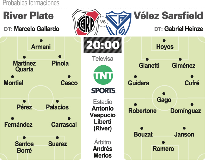 Por la lesión que sufrió ante los mendocinos el uruguayo Nicolás De La Cruz, ingresará el colombiano Carrascal, mientras que habrá una variante en la zaga central con la salida del chileno Paulo Díaz y la inclusión de Pinola.