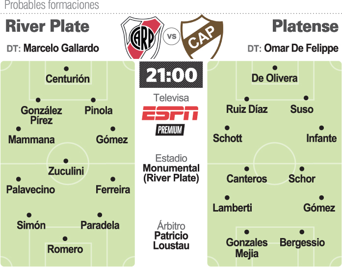 River Plate, ya clasificado en la Zona A de la Copa de la Liga Profesional y con una formación alternativa, será local hoy ante Platense, que necesita con urgencia puntos para incrementar el promedio para el descenso, en un cotejo por la 14ta. y última fecha de esta fase del torneo. El partido se jugará a partir de las 21 en el estadio Monumental de Núñez, será televisado por ESPN Premium y arbitrado por Patricio Loustau. River (26 unidades) se clasificó en forma anticipada para los cuartos de final del torneo doméstico y pretende cerrar otra muy buena semana con un triunfo, aunque no podrá ser primero en su zona porque Racing (30) se aseguró ese lugar con su empate ante San Lorenzo (1-1).
