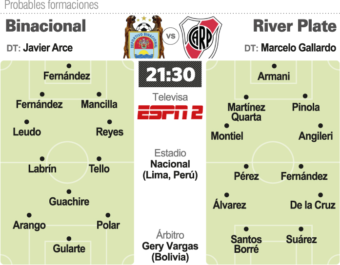 River visitará hoy a Binacional de Perú, en Lima (21.30 horas, por ESPN 2), en donde el equipo de la altura de Juliaca hará de local, en un encuentro clave por la clasificación a los octavos de final de la Copa Libertadores.