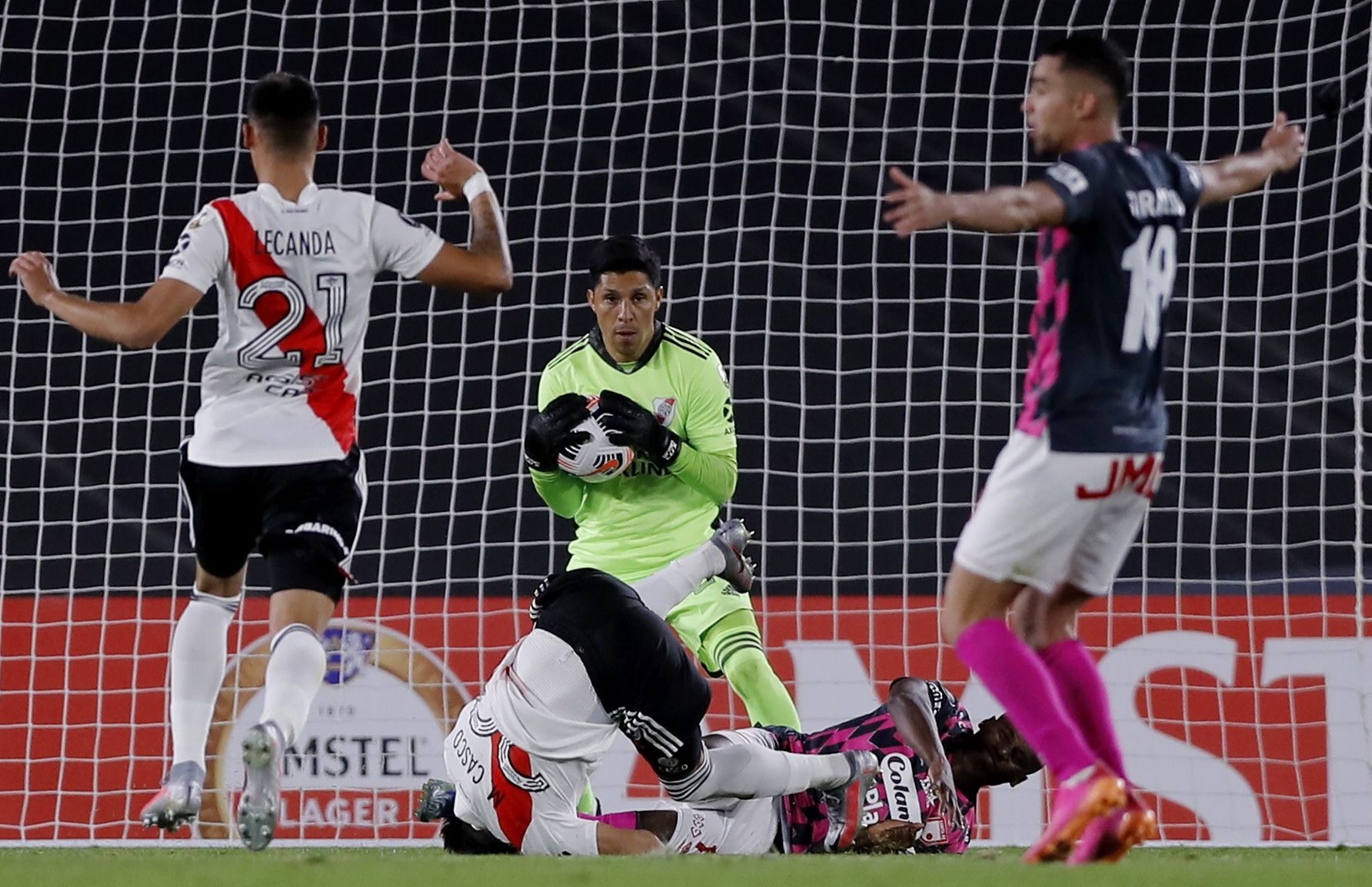 No hubo tiempo ni siquiera para sufrir en Núñez en la etapa inicial. El conjunto de Marcelo Gallardo asumió de inmediato la idea de atacar a su par colombiano y disputar la pelota lo más lejos posible del arco defendido por el mediocampista, que se calzó los guantes y se plantó entre los postes del Estadio Monumental más allá de sus dolencias musculares.