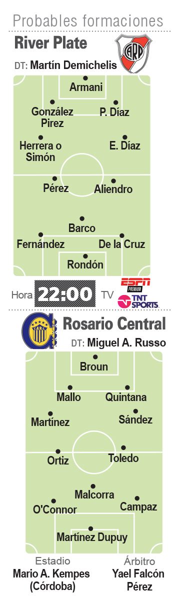 Casco se había perdido el partido de cuartos de final ante Belgrano por una sinovitis pero tuvo el alta médica para entrenar a la par del resto del plantel y cuando estaba para jugar sintió molestias en la rodilla que luego tras los estudios se comprobó la gravedad y deberá estar inactivo al menos por dos meses. Es por eso que la duda del entrenador pasa por la presencia de Andrés Herrera o Santiago Simón en el lateral derecho. En la zona ofensiva, River tendrá a varios futbolistas de buen pie como Rodrigo Aliendro, Nicolás De La Cruz y Esequiel Barco para alimentar al atacante Salomón Rondón, uno de sus goleadores con seis tantos en la Copa de la Liga.