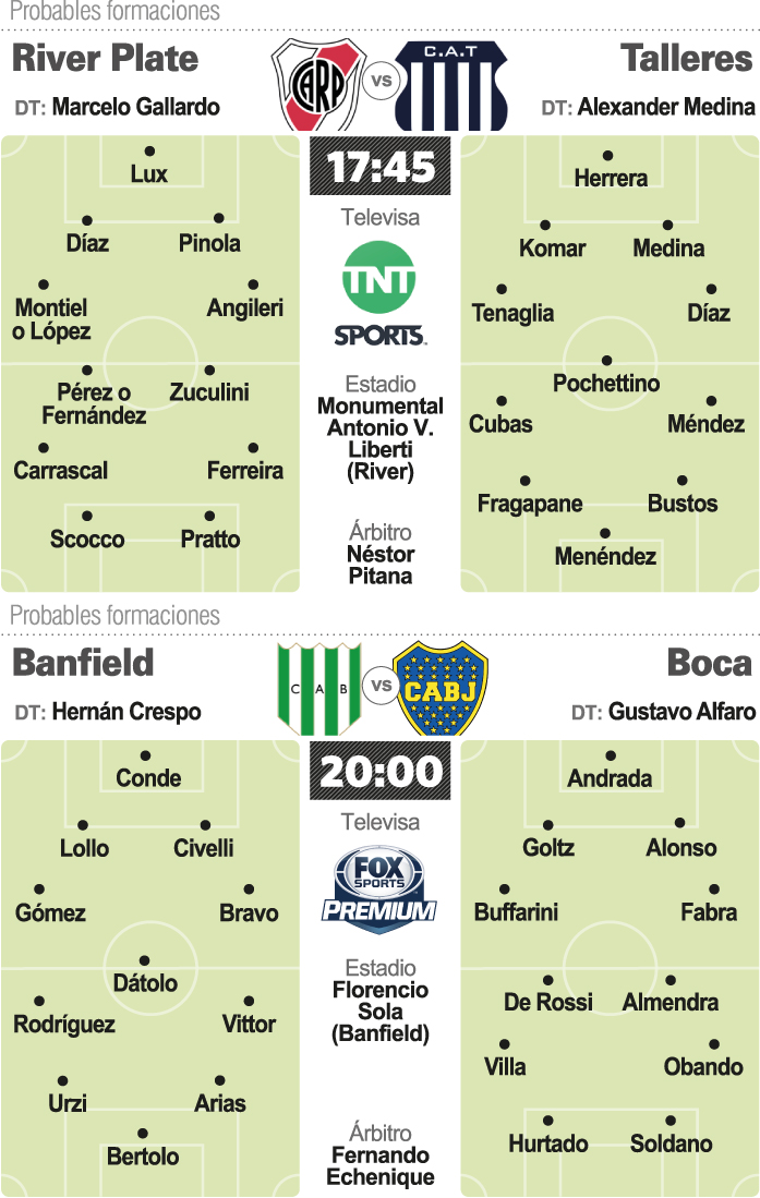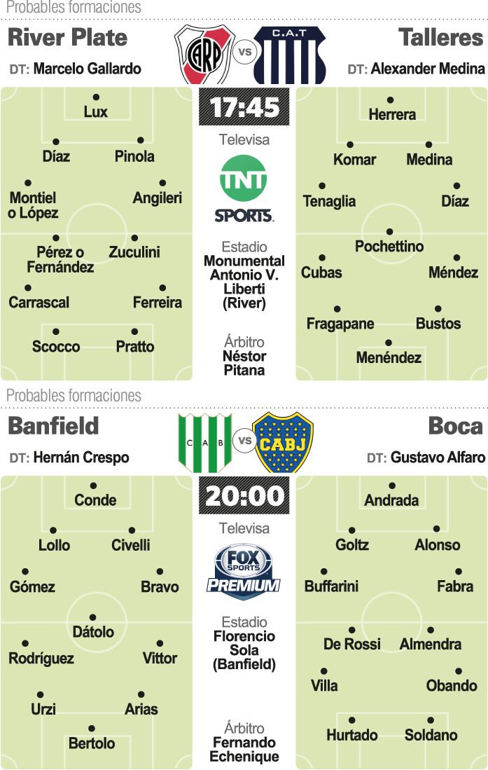 Hoy, los Millonarios recibirán a Talleres de Córdoba (desde las 17.45) y los Xeneizes visitarán a Banfield (a las 20). Los dos se guardan jugadores para los partidos de vuelta de los cuartos de final de la Copa.