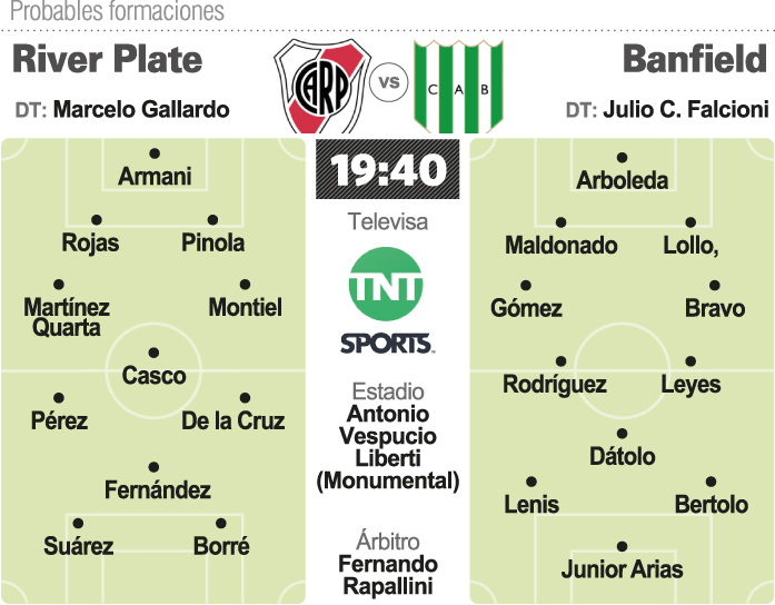 El líder River Plate recibirá hoy a Banfield (19.40), en uno de los dos encuentros importantes de la 20ma fecha de la Superliga Argentina de Fútbol. En el otro, su escolta Boca Juniors visitará a Central Córdoba de Santiago del Estero (21.50). En el restante partido, Lanús recibirá a Newell"s (19.40).