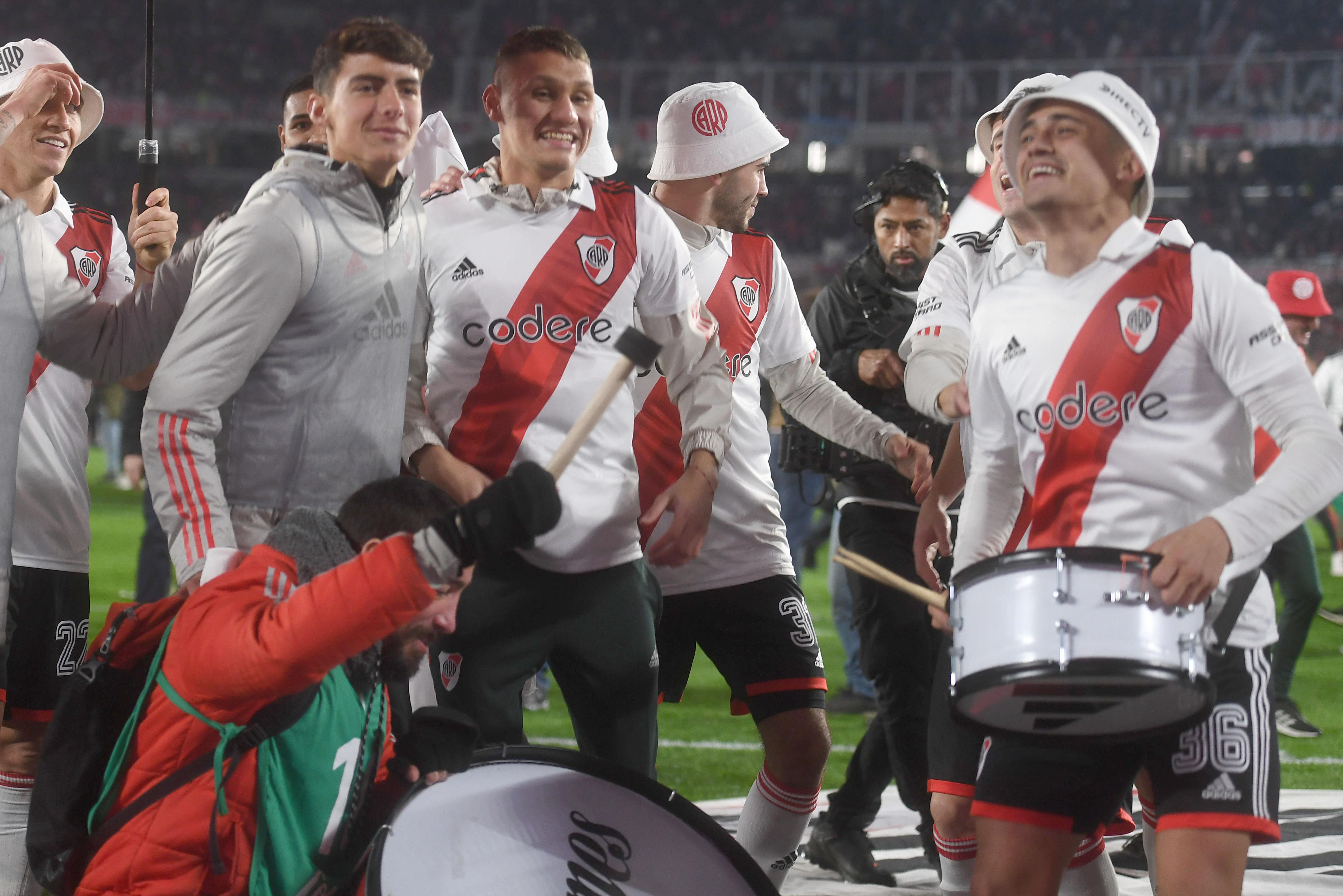 Al compás del tamborín. Pablo Solari no para tocando el redoblante. Al lado sus compañeros y los juveniles también festejan. La fiesta fue completa en el Monumental. River y otra corona en sus vitrinas.