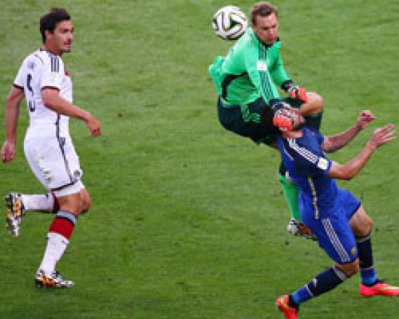 El árbitro italiano Nicola Rizzoli, que tuvo a cargo la final del Mundial de Brasil entre Alemania y Argentina, se refirió a su decisión de no cobrar un claro penal del arquero alemán Manuel Neuer sobre Gonzalo Higuaín: "Respecto a esa jugada, Neuer llega primero a la pelota. Gonzalo protestó en ese momento pero, cuando terminó el partido, tanto él como los otros argentinos me felicitaron diciéndome que había arbitrado de manera perfecta. Cuando volví a ver las imágenes me di cuenta que tampoco le había cometido falta al arquero alemán. Eso debo decirlo".