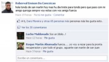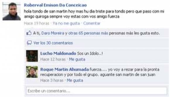 Al respecto, su compañero Roberval utilizó las redes sociales para solidarizarse y brindarle, vía Facebook, su apoyo a Quiroga. “Hola tondo de san martin, hoy mas hu dia triste para tondo, pero que paso com mi amigo Quiroga sempre voy estas com vos amigo fuerza”, publicó en portugués el delantero brasileño.