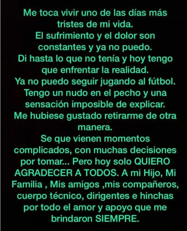 "Me toca vivir uno de los días más tristes de mi vida. El sufrimiento y el dolor son constantes y ya no puedo. Di hasta lo que tenía y hoy tengo que enfrentar la realidad. Ya no puedo seguir jugando al fútbol. Tengo un nudo en el pecho y una sensación imposible de explicar. Me hubiese gustado retirarme de otra manera", fueron las sentidas palabras del uruguayo.
