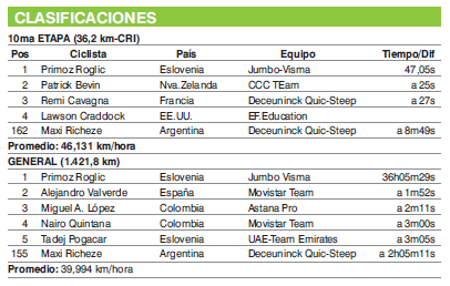 El anterior líder, el mencionado Nairo Quintana (Movistar), marcó un tiempo 3m06s más lento que el del nuevo líder en la etapa para situarse cuarto en la general a tres minutos. Al Movistar, con sus dos arietes (Nairo y Valverde) y el resto del conjunto telefónico, le ha llegado el momento de demostrar cual será su plan para conquistar una carrera que luego de la contrareloj de ayer se les complicó y contará solo con el Astana como interesado aliado. En quinta posición de la clasificación general se ubica el sorprendente Tadej Pogacar (UAE), de 20 años. El joven de 21 años, se sitúa a 5s de Quintana y a menos de un minuto del podio uniéndose a la fiesta por conquistar un lugar en el cajón de Madrid, luego que su equipo el UAE cediera tiempo, por una caída en la primera etapa.