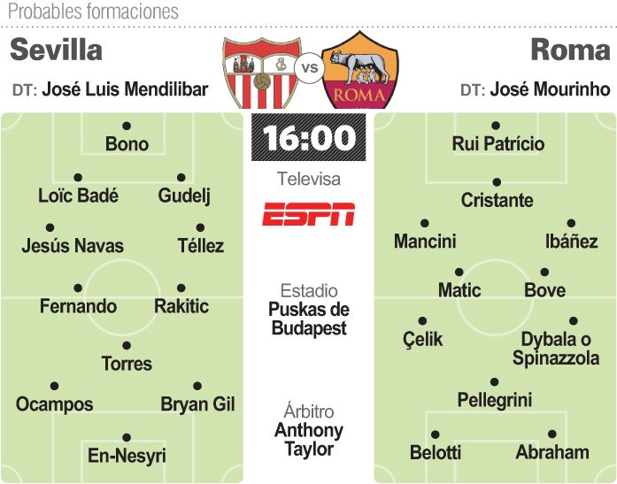 En la Roma está en duda Dybala a causa de una lesión en el tobillo, aunque por tratarse de una final y de que es uno de los jugadores preferidos del entrenador del equipo, el portugués José Mourinho, es probable que ocupe un lugar entre los suplentes.