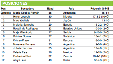 Mirando el ranking mundial de la FIB quien figura como primera retadora es la nigeriana Helen Joseph, quien tiene una campaña de 22 peleas con 17 victorias (10 KO), 3 derrotas y 2 empates. En ese escalafón (ver recuadro) en noveno y décimo puesto figuran las dos últimas boxeadoras vencidas por la campeona mundial y hasta la séptima colocación todas las rivales son de diferentes países, por lo que dentro de la negociación si a la nigeriana Joseph no le convence la pelea -ergo el dinero que puedan ofrecerle para pelear por la corona ecuménica- quienes manejan la campaña de Román irán tirando líneas para encontrar otra rival y cumplir con la norma.
