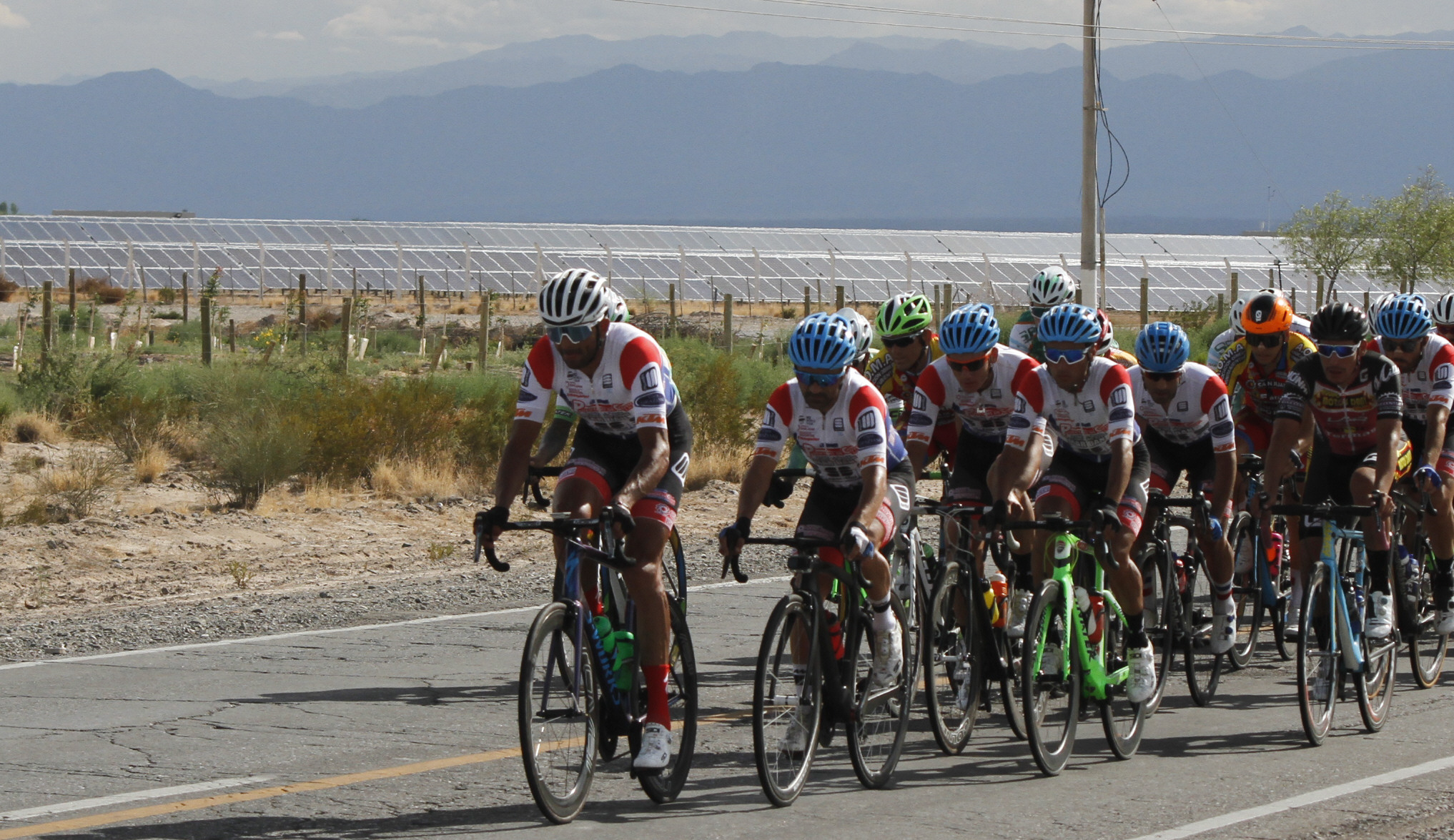 No sólo de cal se vive en Sarmiento. El parque de energía solar y una flamante plantación de pistachos, a su lado, son el fondo de esta clásica postal del ciclismo rutero local.