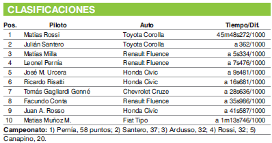 Mientras que Rossi y Santero fueron pura efectividad para darle a Toyota la sumatoria de puntos más abundante en este inicio de temporada, los dos mejores Renault se ubicaron tercero y cuarto. Precisamente, Leonel Pernía arañó el podio y cerró con balance positivo el fin de semana tras no pasar el corte clasificatorio del sábado y largar octavo ayer.