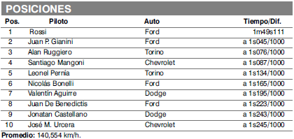 Su inmediato perseguidor, Juan Pablo Gianini (Ford) quedó a 1s045/1000, mientras que en tercera colocación se ubicó Alan Ruggiero (Torino), a 1s076/1000.