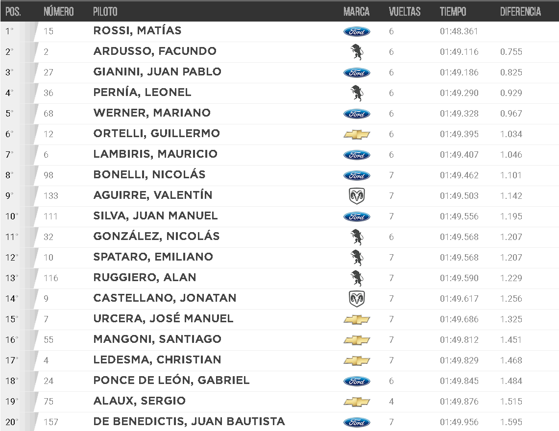 En el primer grupo, Juan Tomás Catalán Magni se metió segundo, pero le quitaron la vuelta por exceder los límites de la pista Sin embargo, en el último intento, el arrecifeño consiguió esa posición, detrás de Matías Rossi que seguía al frente.