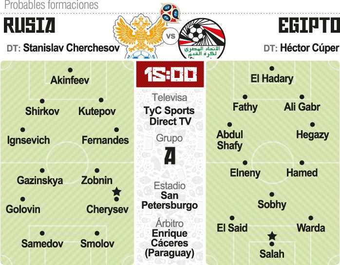 El seleccionado de Rusia, que en su debut en el Mundial 2018 goleó 5-0 a Arabia Saudita, enfrentará hoy a Egipto, dirigido por el argentino Héctor Cúper, que en la primera fecha del Grupo A cayó ante Uruguay, en los últimos minutos, por 1-0.