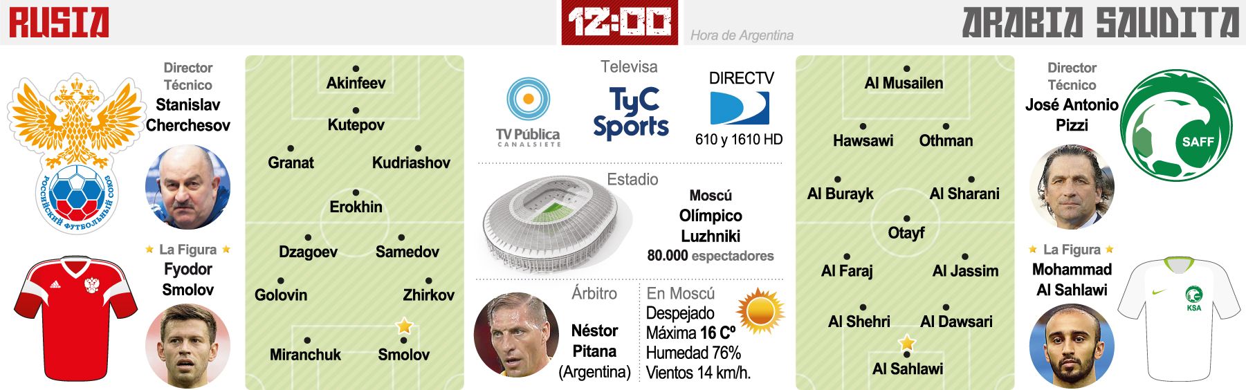 El seleccionado de Rusia, que sustentado en su localía buscará acceder por primera vez a los octavos de final en su cuarta participación mundialista, jugará hoy ante Arabia Saudita, dirigido por el argentino Juan Antonio Pizzi, en el cotejo inaugural de la XXI Copa del Mundo de Fútbol.