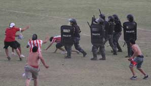 Todo ocurrió ayer en cancha de Alianza, con un duro enfrentamiento entre hinchas y efectivos policiales cuando a diez minutos de la finalización del partido, un grupo de simpatizantes de Rivadavia (que ganaba el partido 2 a 1) decidió invadir el campo y comenzar a festejar el ascenso a la primera división. Acto seguido, el árbitro determinó la suspensión del encuentro.