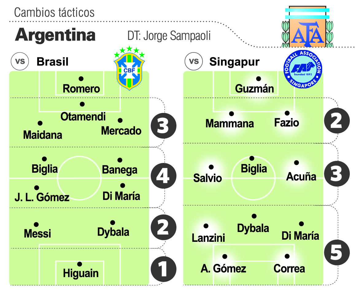 De confirmarse esta alineación, Argentina repetiría sólo tres jugadores de los que comenzaron ante Brasil: Di María, Biglia y Dybala.