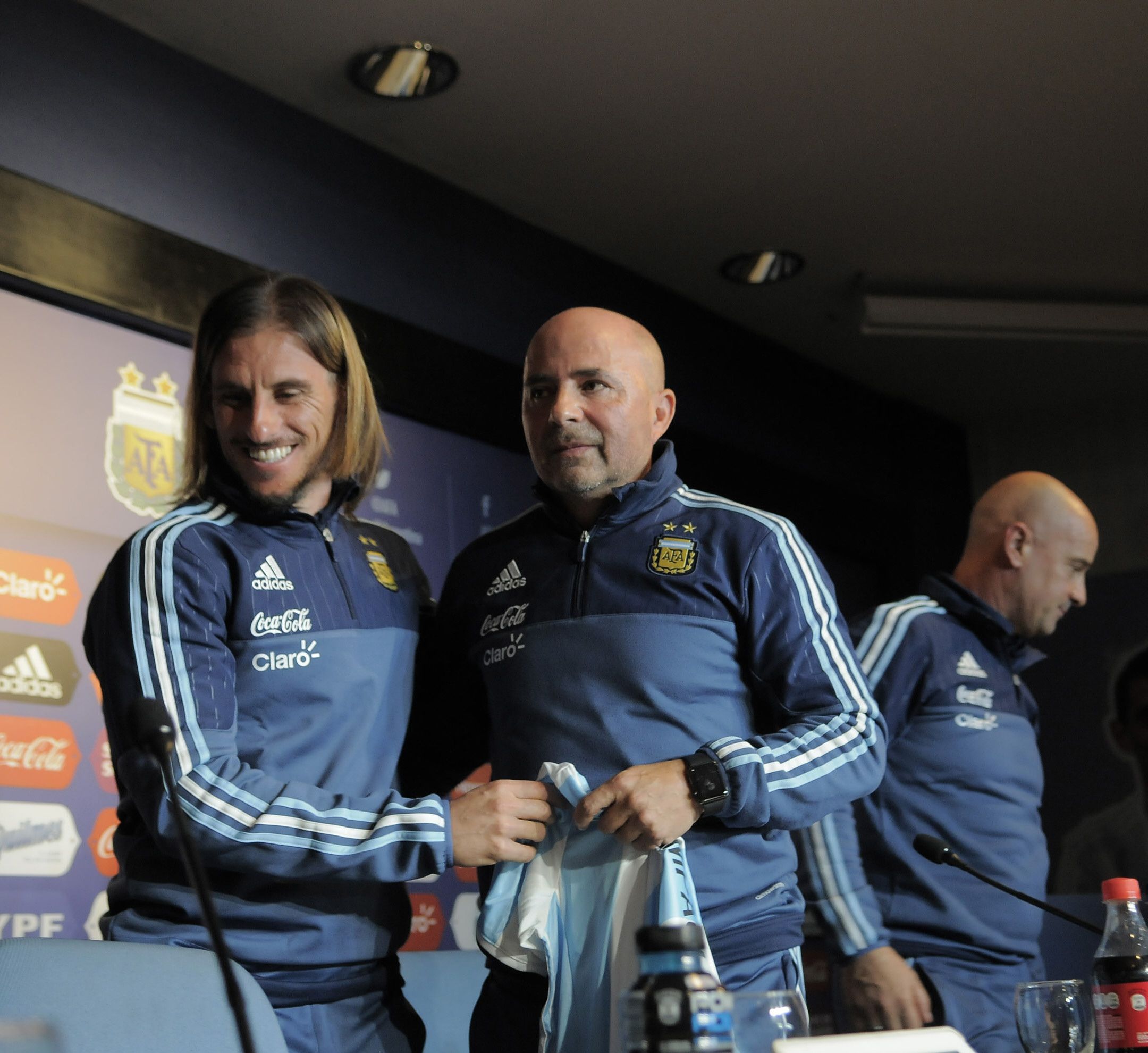 En la oficialización de su cargo, Sampaoli estuvo acompañado por su asistente técnico, Sebastián Becaccece, el preparador físico, Jorge Desio, el presidente de la Asociación del Fútbol Argentino, el sanjuanino Claudio ‘Chiqui’ Tapia, y el flamante mánager de Selecciones Nacionales y campeón del mundo, Jorge Burruchaga.