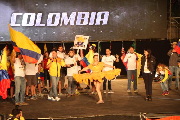 El escenario circular montado sobre la rotonda del cruce de estas avenidas fue recibiendo a los competidores de los 23 países presentes. El desfile comenzó con Bélgica y marchó a buen ritmo. Los alemanes subieron agitando pequeñas banderas, los japoneses llevaban sables de juguete, los mexicanos con gorritos de personajes de lucha libre, y los uruguayos con la indumentaria para correr.