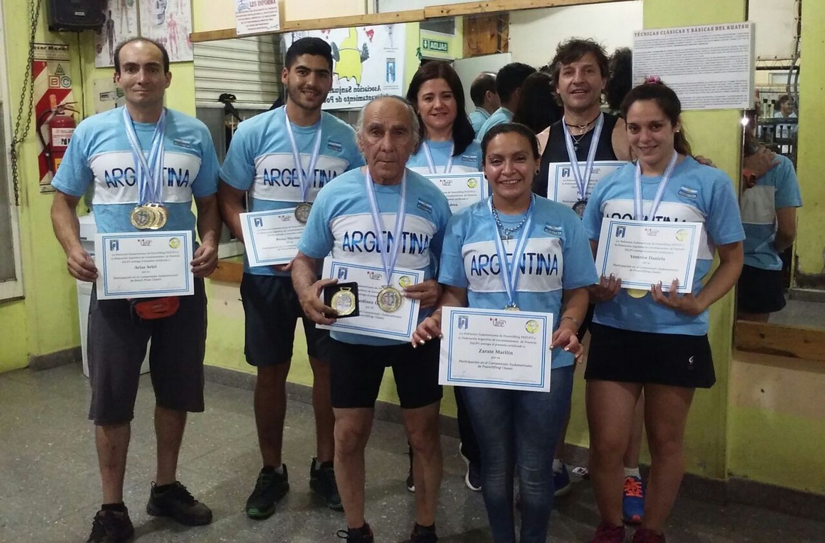 en varones, Oscar Sardinez (cat. Master IV -59 kg): campeón sudamericano de Potencia; Guillermo Castillo (Subjunior -66 kg) 4to en Potencia; Nicolás Pérez (Junior -74 kg) 3ro en Potencia; Ariel Arias (Master I -74 kg) campeón sudamericano en Potencia, con récord sudamericano en fuerza en banco y despegue, también campeón en fuerza en banco Raw y Power (con equipo); Patricio Vázquez (Open -74 kg) campeón sudamericano fuerza en banco; Miguel Palomas (Master II -83 kg) campeón sudamericano en Potencia con récord sudamericano en sentadilla y despegue; 2do en fuerza en banco Raw y campeón en fuerza en banco Power; Juan Galdeano (Master I -93 kg) 2do en fuerza en banco Power; en damas: Andrea Ortiz (Master I -63 kg) campeona sudamericana en Potencia; Marilín Zárate (Open -52 kg) 4ta en Potencia; Daniela Ventrice (Open -57 kg) 4ta en Potencia; Irene Maldonado (Open -72 kg) 4ta en Potencia.