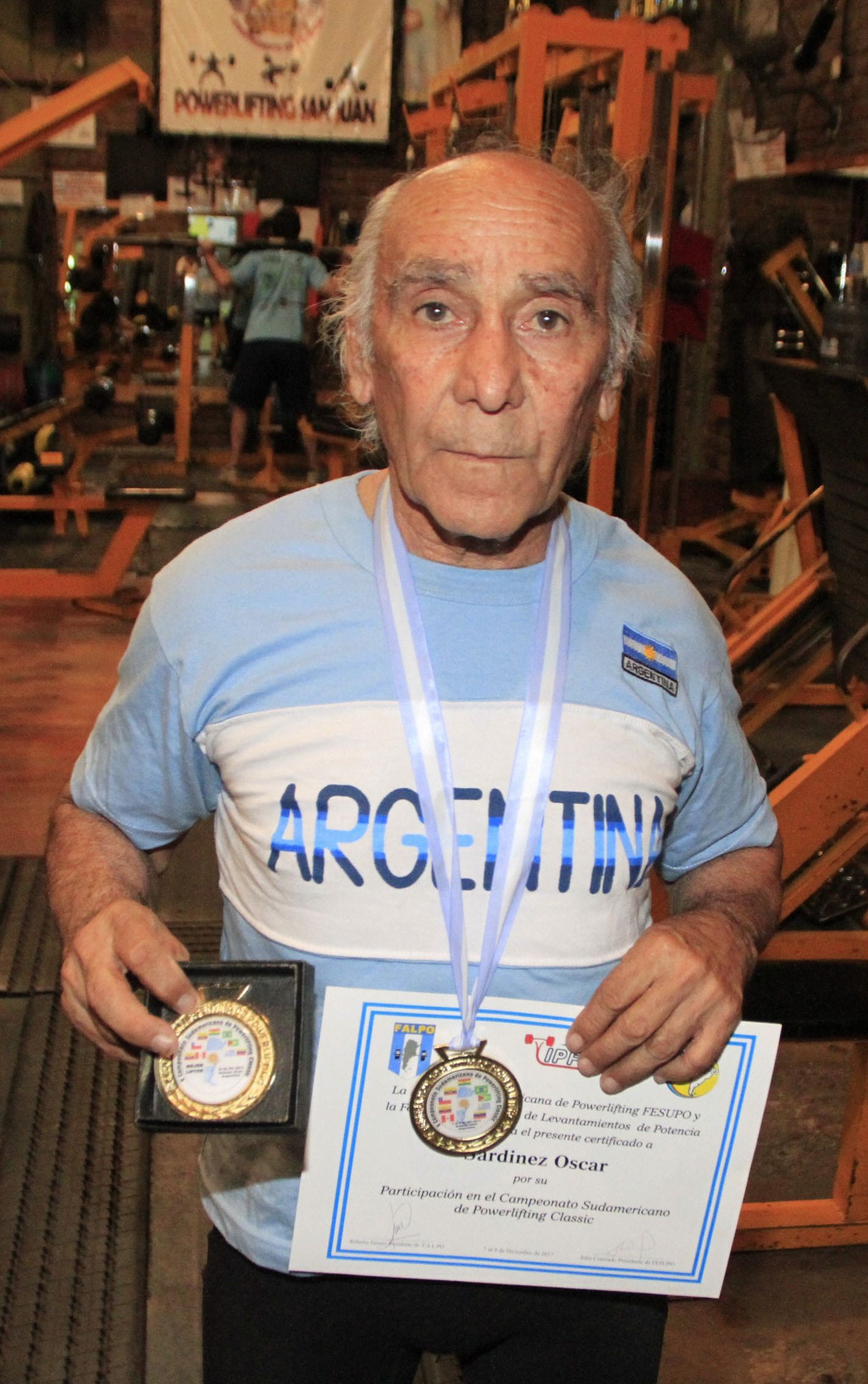 A los 77 años, Oscar Sardinez (foto) demostró que todavía está muy vigente y en el Sudamericano consiguió dos récords mundiales dentro de la categoría más alta: Master IV. Con 120 kilos en sentadilla y 155 kilos en despegue tuvo una actuación destacada, incluso obteniendo el mejor coeficiente del certamen en su categoría.