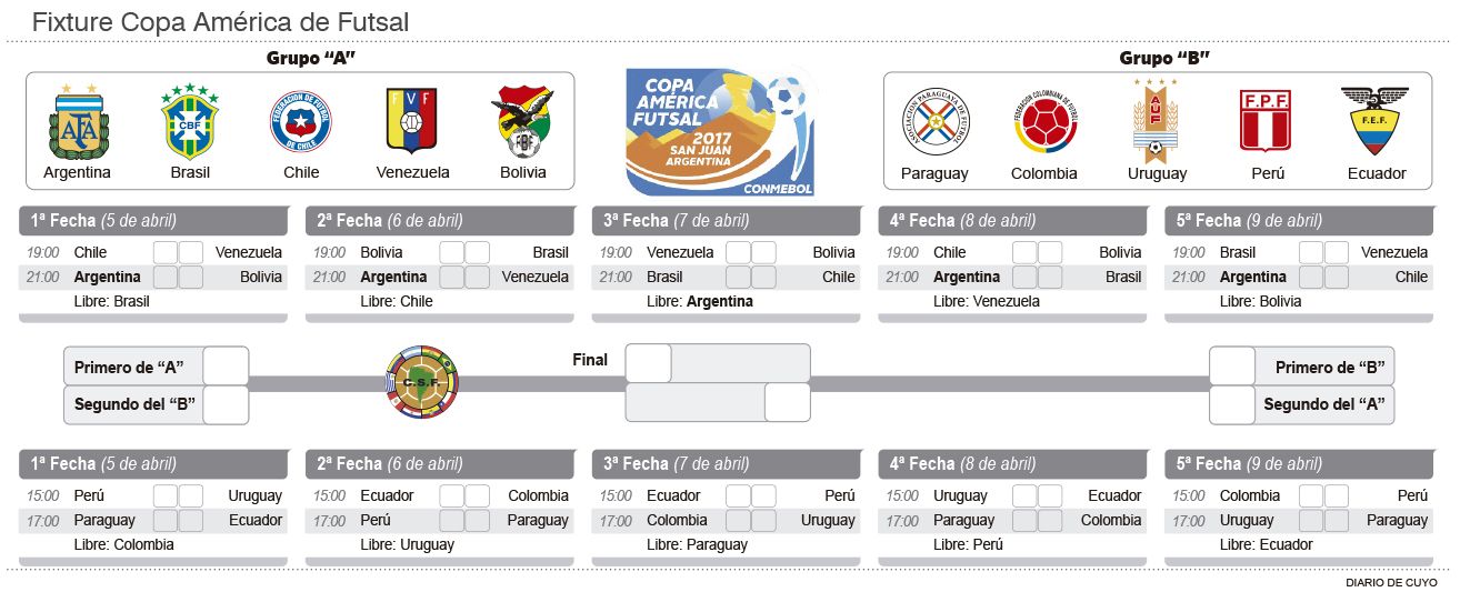 Pero mañana empieza la acción y con los seleccionados en su mayoría ya instalados en San Juan, es bueno repasar los horarios, partidos y entradas para disfrutar lo mejor del futsal del continente en el Cantoni. Serán dos zonas con 5 equipos cada una, donde jugarán todos contra todos para clasificar los dos primeros a las semifinales, remarcando que el día libre será el lunes 10.