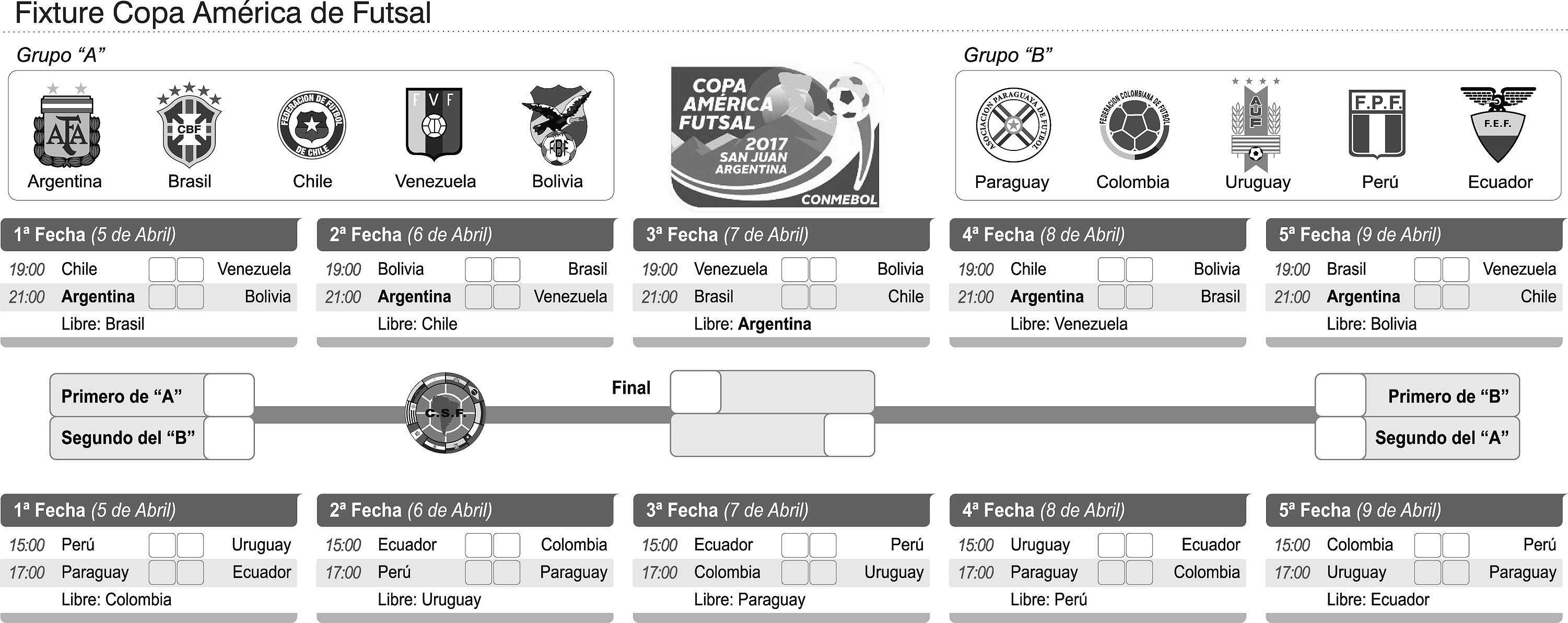 Ya hay ambiente para la Copa América de Futsal 2017 en San Juan. En la previa de lo que será el inicio de la competencia con los 10 seleccionados del continente y la presencia estelar del actual campeón del mundo que es Argentina, se realizó ayer el sorteo de los grupos y se confeccionó el fixture del certamen que comenzará el miércoles 5 de abril y culminará el miércoles 12. Una semana completa para disfrutar en el Estadio Aldo Cantoni con lo mejor del continente en el futsal con la participación de Brasil, Colombia y hasta el mismo Paraguay que son grandes cultores de este deporte que en nuestra provincia adquirió una evolución sensacional siendo hoy por hoy el deporte que más creció en todo sentido.