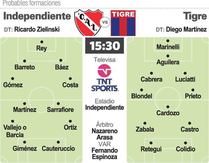Por su parte, Independiente recibirá a Tigre, desde las 15.30, con arbitraje de Nazareno Arasa. El Rojo suma 14 puntos en el campeonato pero lleva dos partidos sin perder, en los que sumó una victoria (2-0 vs. Belgrano, de local) y un empate (2-2 vs. Argentinos, de visitante), y con eso logró olvidarse momentáneamente del descenso por tabla general. El sanjuanino Matías Giménez saldrá como titular en el equipo de Avellaneda.