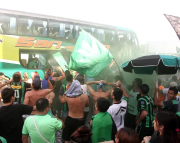 Todo en dos colores, con gargantas ardiendo y la misma pasión. Desde las 16, ya empezaron a juntarse y sobre las 17,30 empezó el show de verdad. El primero de los futbolistas en llegar fue Mariano Monllor desatando la locura. Fotos, abrazos y un recorrido que se hizo eterno para llegar al colectivo. Después fueron sumándose: Manuel Llano, Augusto Aguirre, José Villegas, Abel Masuero, Y así, uno a uno hasta que llegó César Monasterio y estalló todo en Concepción. Las bengalas de humo cruzaron el aire del Pueblo Viejo, convirtiendo en una postal inolvidable la salida de un San Martín que irá por todo en Mendoza.