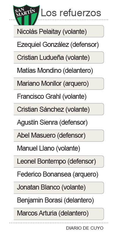 En los nombres, el cierre de semana fue intenso para San Martín ya que a la docena de incorporaciones que ya había concretado, le sumó tres nombres más: dos delanteros y un volante central. Así, son 15 los refuerzos del equipo de Andrés Yllana que ya empezó a perfilar una idea con línea de tres, dos externos, tres volantes y dos puntas. El volante central Jonatan Blanco y los atacantes Benjamin Borasi y Marcos Arturia completaron la legión de incorporaciones y los tres ya firmaron los respectivos contratos con San Martín.