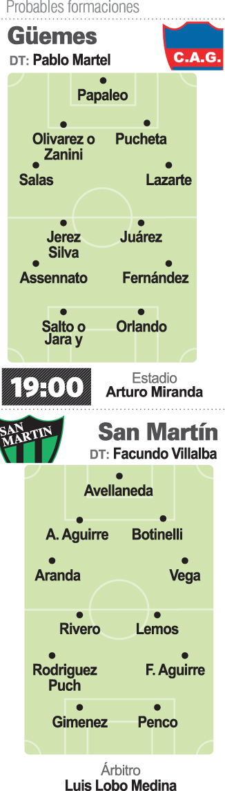 Enfrente estará el nuevo Güemes de Pablo Martel. De la enorme campaña del año pasado pocos nombres quedaron y hasta ahora no pudo ganar. Arrancó empatando de local con Estudiantes de Caseros y viene de caer en Atlanta. Arian Pucheta y Luis Jerez Silva, dos ex-San Martín, serán titulares en un equipo que de local, se quiere hacer sentir. Estará en San Martín potenciar lo bueno propio y agigantar la presión de Güemes.
